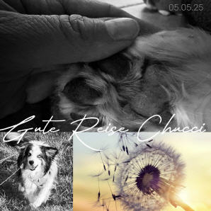 Am 05.05.2025 erreichte uns die traurige Nachricht, dass auch Chucci sich mit fast 14 Jahren auf seine letzte Reise gemacht hat. Es ist, als wäre es erst gestern gewesen, als er mit Heaven 2016 seine Begleithundeprüfung abgelegt hat.