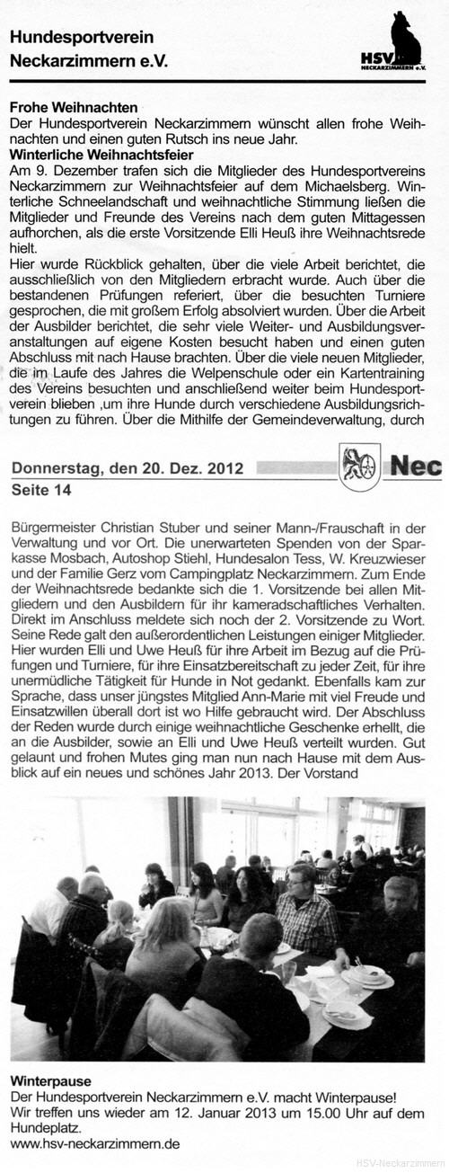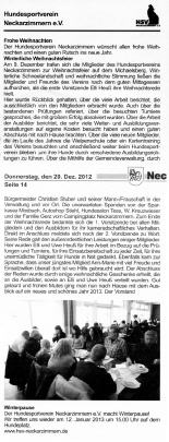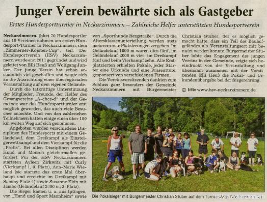 Bereits am 06.01.2012 nahmen einige unsere Mitglieder mit ihren Hunden beim Hunderennen des VdH Ladenburg e.V. teil. Für den HSV Neckarzimmern e.V. erreichten wir Platzierungen im vorderen Drittel und Mittelfeld (13, 16, 17, 30). Am Start waren: Floh mit K. Kienzler, Yoshi mit P.+T. Fritz, Shila mit J. Kienzler und Curly mit A. Zirkwitz. Das Starterfeld unterteilte sich in 6 Gruppen und in der aktiven Gruppe waren insgesamt 46 Hunde am Start. Bei einer Laufstrecke von 75 Mtr. wurde der Hund ermittelt, der am schnellsten vom Startpunkt zu seinem Frau/Herrchen laufen konnte, die im Ziel auf ihn warteten. Die Zeitmessung erfolgte elektronische und es ging dabei oft nur um eine 100stel Sekunde Unterschied. Ein echter Spaß und Danke an unsere Mitglieder, die den Verein so würdig vertreten haben!