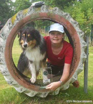 Nach der Gehorsamsübung, in der ein verkürztes Laufschema der Begleithundeprüfung gezeigt wird, ging es direkt weiter mit den sportlichen Laufdisziplinen. Emma zeigte sich dieses Mal wenig beeindruckt von den äußeren Einflüssen und war konzentriert, so dass sie auf ihre erste Teildisziplin 52 Punkte (von 60) bekam. Bei den Laufdisziplinen hatten Sina und Emma in allen Teildisziplinen nur 2 Fehlerpunkte (durch Vorprellen beim Hürdenlauf) und sehr gute, schnelle Laufzeiten, so dass es für das Team am Ende mit über 17 Punkten Vorsprung auf Platz 2 für den sensationellen 1. Platz (Gesamtpunktzahl: 259) gereicht hat. Dies bedeutete für Sina und Emma in deren 1. Vierkampfwettbewerb überhaupt auch direkt die erste Qualifikationshürde zum Aufstieg in die nächst höhere Leistungsklasse. Spitze!