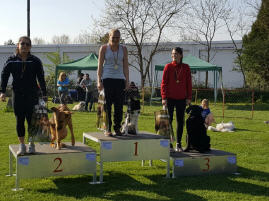 Für Sina Hüther mit ihrer Emma war es der zweite Start im VK 1. Leider zeigte sich Emma in der Unterordnung etwas unkonzentriert, so dass das Team nicht allzu viele Punkte mit in die Laufdisziplinen mitnehmen konnte. Beim anschließenden Hürdenlauf lief Emma sehr souverän, zeigte sich jedoch erneut beim Slalomlauf sehr beeindruckt von den äußeren Gerüchen und wollte zuerst partout nicht durch den Start. Dies kostete wertvolle Sekunden. Beim zweiten Lauf und auf der anschließenden Hindernisbahn konnte Emma mit Sina wieder ihr volles Potential zeigen, so dass es am Ende für einen 6. Platz mit 227 Punkten reichte.